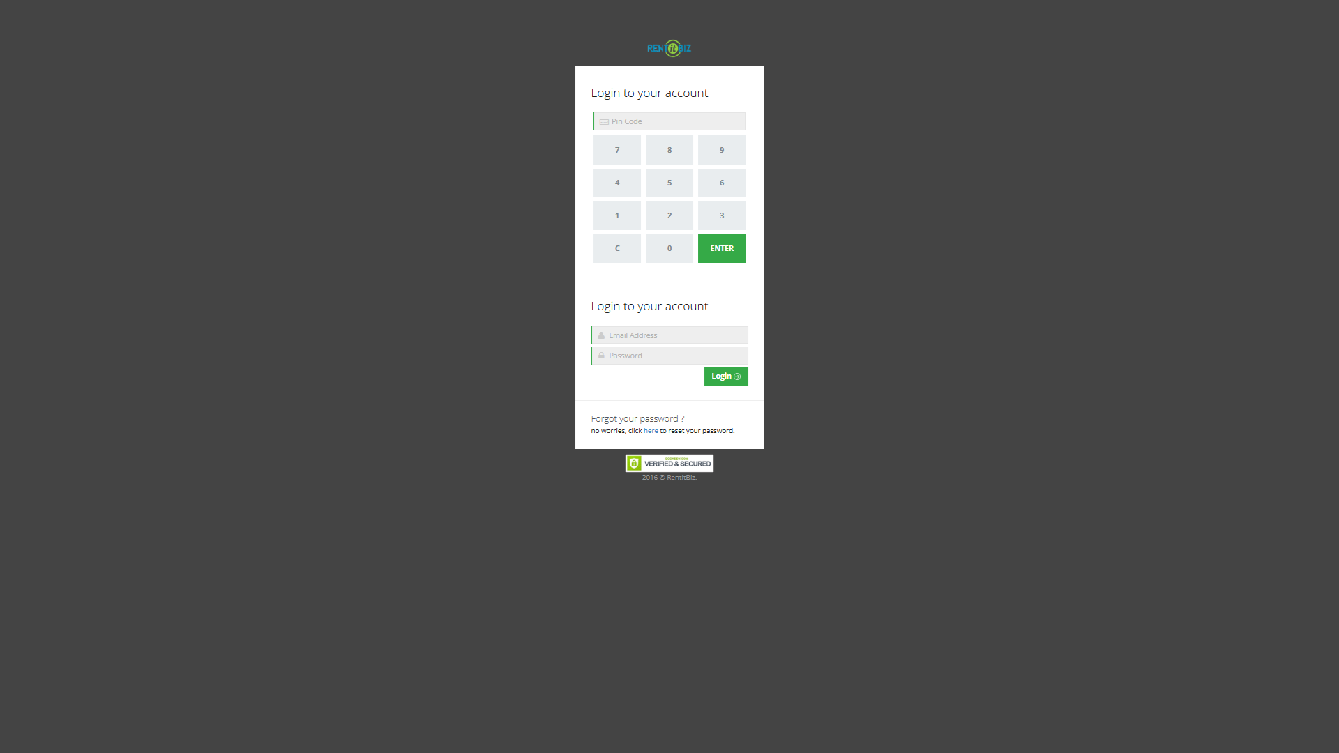 The first time logging into Rent It Biz POS Enter email and password. The next time logging in, it only ask for the your assigned PIN.